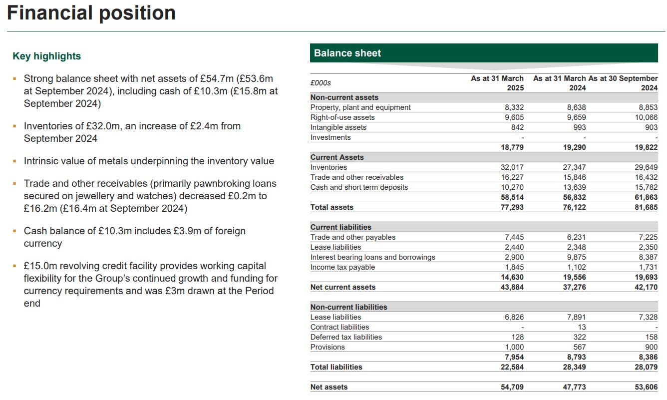 Ramsdens maintains a robust financial position with a strong balance sheet, characterised by increasing net assets, significant cash holdings, and a managed debt facility.